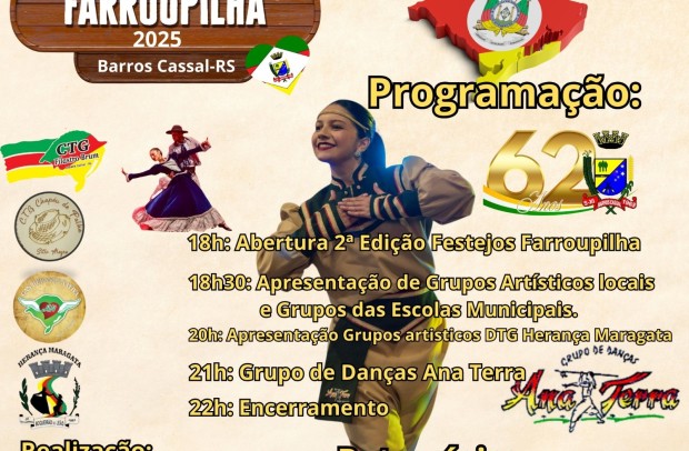 A Prefeitura de Barros Cassal, por meio da Secretaria da Cultura e Turismo, convida toda a comunidade para uma noite autêntica em homenagem às nossas tradições. Será realizado o 2º Festejos Farroupilha, no CTG Chapéu de Palha, no interior de Sítio Alegre.