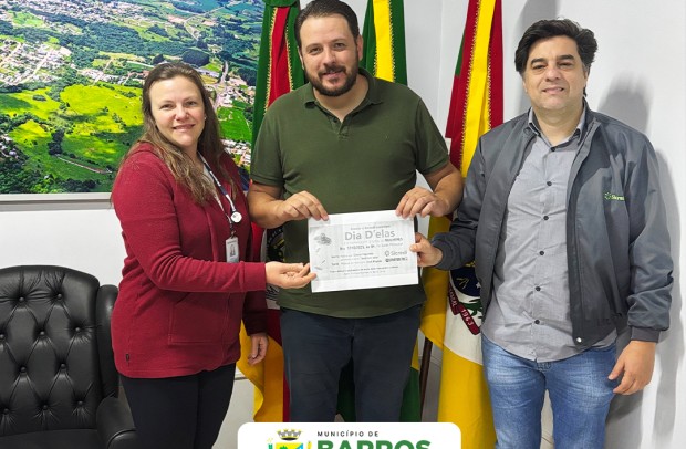 Na manhã desta terça-feira, 30 de setembro, o prefeito Joviano Zago recebeu em seu gabinete o gerente do Sicredi, Maurício Silveira, e a extensionista da Emater, Pamela Bergonci. Na ocasião, foi entregue o convite para um evento dedicado a celebrar e homenagear todas as mulheres do nosso município: o Dia D'Elas! 💜